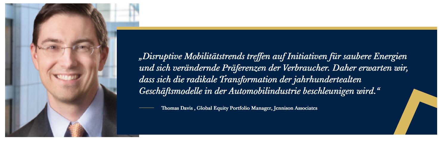 Thomas Davis, CFA, Global Equity Portfolio Manager bei Jennison Associates, erklärt: „Elektrofahrzeuge, Fahrzeugakkus und intelligentere Halbleiterchips mit künstlicher Intelligenz, die paralleles Denken ermöglichen, sind aktuell interessante Möglichkeiten, um auf dieses Thema zu setzen. Doch sobald die geeignete Infrastruktur aufgebaut ist und sich die Fähigkeiten und Möglichkeiten des autonomen Fahrens verbessert haben, dürften unserer Ansicht nach disruptive Mobilitätstrends wie Ride-Sharing, Robo-Taxis und Monetisierungsdienste in Autos den Turbo einlegen.“