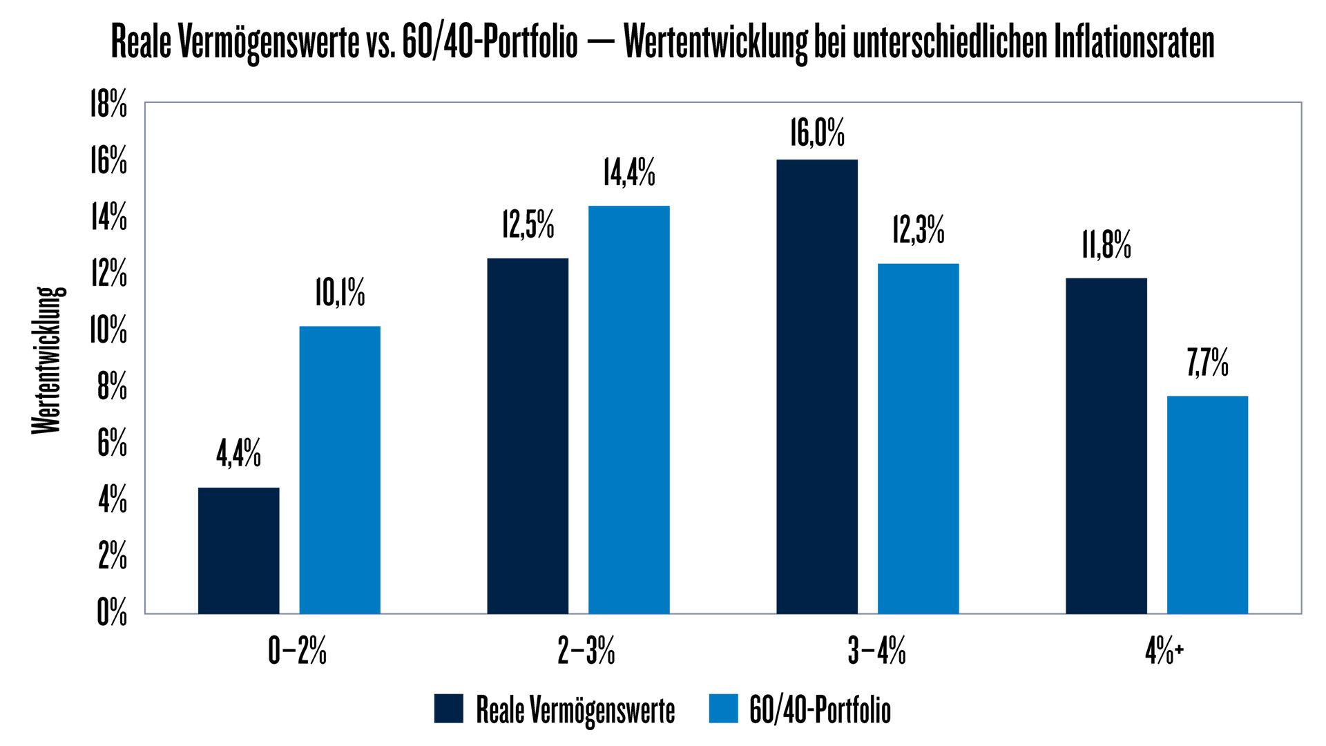 Quelle: FactSet. Die Wertentwicklung in der Vergangenheit ist keine Garantie für künftige Ergebnisse. Hinweis: Anzahl der vierteljährlichen Beobachtungen je Bereich: Jeweils 44, 49, 32 und 58 für die Inflationsbereiche 0%-2%, 2%-3%, 3%-4%, über 4%. Inflationsbereiche werden anhand der Inflation im Vergleich zum Vorjahr festgelegt, Messungen erfolgen vierteljährlich. Das Portfolio von realen Vermögenswerten besteht aus 25% TIPS, 12,5% US-REITs, 12,5% REITs aus Industrieländern ohne USA, 18% Rohstoffen, 3% Gold, 10% globaler Infrastruktur, 9% natürlichen Ressourcen und 10% MLPs. Das 60/40-Portfolio besteht aus 60% US-Aktien und 40% US-Anleihen gesamt. Hinweis: Die Angaben zur Wertentwicklung der Anlageklassen gelten für den Zeitraum von 1973 bis 2020. Diversifikation bietet weder eine Garantie für Gewinne, noch eine Verlustabsicherung in Baisse-Märkten.