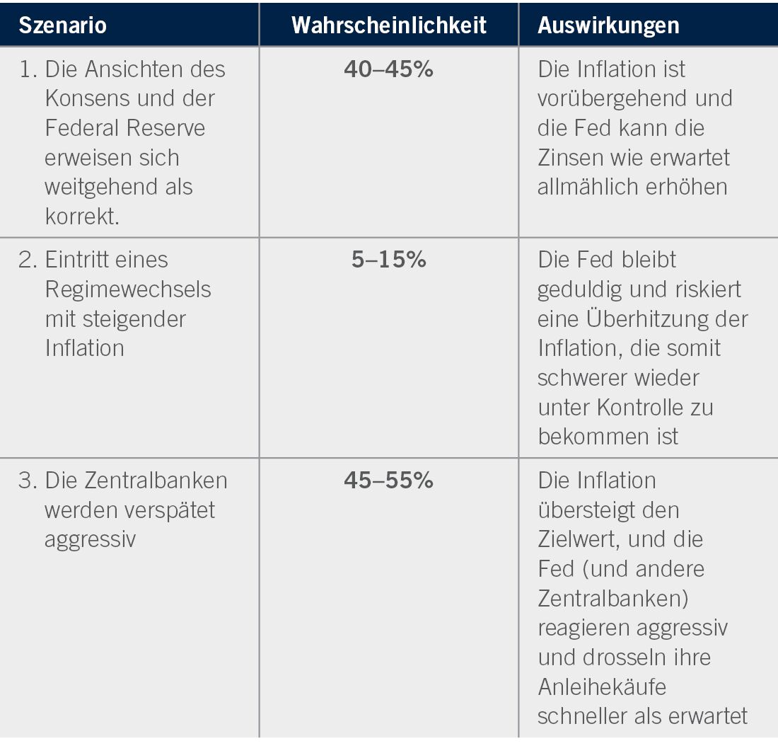 Die Inflation ist im Jahr 2021 aufgrund von Basiseffekten, höheren Rohstoffpreisen, aufgestauter Nachfrage und fiskalischer Lockerung stark gestiegen. Wir rechnen zwar damit, dass der Preisdruck in der zweiten Jahreshälfte etwas nachlassen dürfte, sind aber nicht davon überzeugt, dass die Inflation so stark zurückgeht wie allgemein erwartet. Während die niedrigen Basisjahreffekte aus dem Jahr 2020 abklingen dürften, wird die Nachfrage wohl noch eine Zeit lang das Angebot übersteigen. Der Anstieg der Rohstoffpreise spiegelt darüber hinaus mehr wieder als nur eine Erholung, an den meisten Rohstoffmärkten sind Abschläge zu verzeichnen, was auf höhere Futures-Preise hinweist als derzeit erwartet. Wir sind davon überzeugt, dass die weitere Entwicklung davon abhängt, dass sich eines der folgenden drei Szenarios verwirklicht.