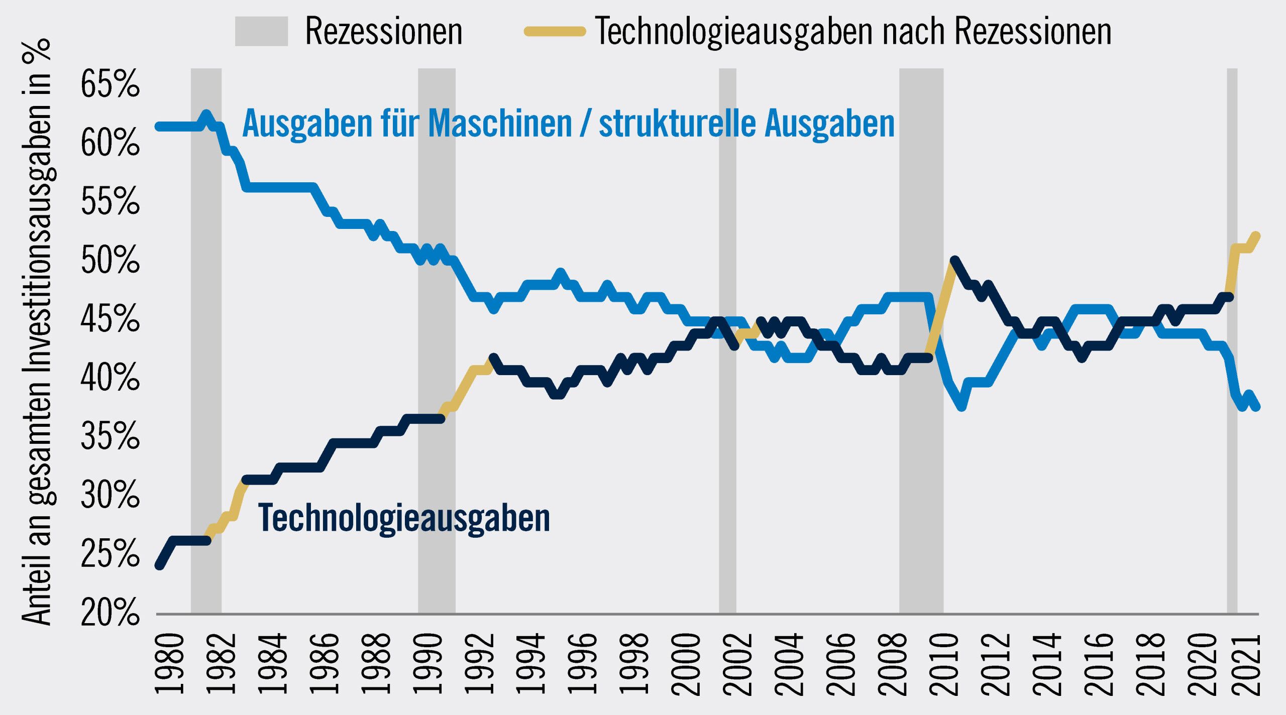 Quelle: FRED, Jennison, Stand: 31. März 2021. Technologieausgaben = Ausgaben für Software, Forschung & Entwicklung, Ausrüstung zur Informationsverarbeitung. Ausgaben für Maschinen / strukturelle Ausgaben = Ausgaben für Transport- & Industrieausrüstung sowie Strukturen.