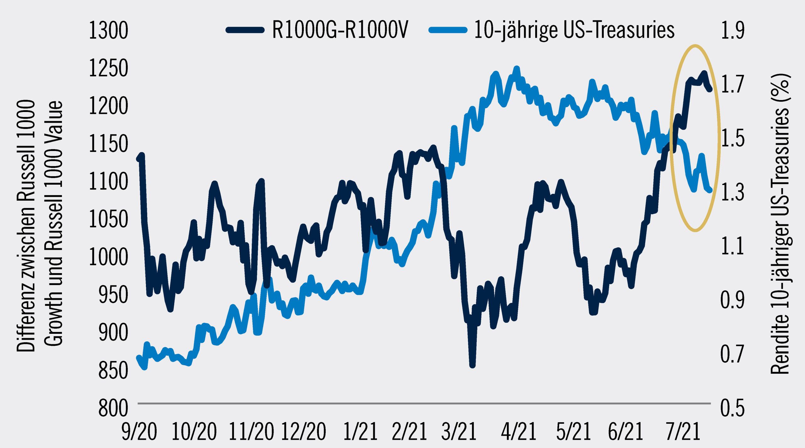 Mit der erfolgreichen Entwicklung wirksamer Impfstoffe haben zyklische Value-Aktien aufgrund der erheblich verbesserten Aussichten auf eine Erholung stark zugelegt. Die enorme Nachfrage führte in den ersten Monaten des Jahres zu Angebotsdefiziten und -engpässen, führte zu höheren Preisen und ließ die Anleihenrenditen steigen. Doch es machte sich noch eine weitere Realität bemerkbar – Volkswirtschaften können nur einmal wiedereröffnen. Sobald dies geschehen ist, müssen zyklische Aktien von positiven strukturellen Faktoren und Gewinnwachstum Unterstützung erhalten, um weiter zulegen zu können. Andernfalls geben sie wieder nach. Als sich diese Erkenntnis durchsetzte, erreichten die Anleihenrenditen ihre Hochstände. Gleichzeitig begannen Anleger zyklische Positionen zugunsten von Anlagen mit beständigerem Wachstum zu reduzieren. Wenn sich in der Zukunft die zunächst kräftige Erholung und die Effekte der Konjunkturmaßnahmen abschwächen, dürfte das Wachstum der Weltwirtschaft wieder abnehmen. Diese Trendwende sollte die Zinssätze und Inflationsraten langfristig unter Kontrolle halten.