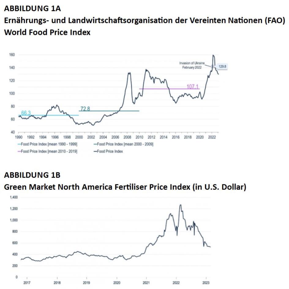 Die Preise für Nahrungsmittel und Düngemittel sind im Vergleich zu ihren jüngsten Höchstständen wieder gesunken. Da jedoch Russland und die Ukraine wichtige Exporteure von Nahrungsmitteln und Russland und Belarus wichtige Produzenten von Düngemitteln sind, befinden sich die Preise immer noch auf historischen Höchstständen. Auch bleibt die geopolitische Lage weiterhin angespannt. Hinzu kommt, dass die volatilen Ölpreise und die zunehmend unsicheren Wetterbedingungen die Kosten für die Produktion und den Transport von Nahrungsmitteln in die Höhe getrieben haben.