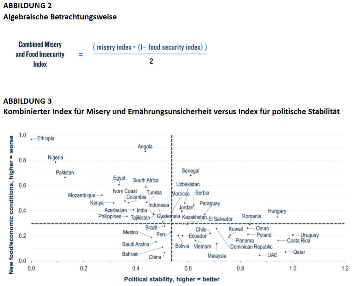 Zunächst wurde für jedes Land ein Misery Index als Summe der jüngsten Arbeitslosen- und Inflationsraten berechnet. Je höher der Wert des Misery index ausfällt, desto schwieriger ist die jeweilige wirtschaftliche Gesamtsituation.3 Damit wird nun auch der Faktor der Arbeitsmarktstabilität in unsere frühere Analyse mit einbezogen, da eine höhere Arbeitslosigkeit eine soziale Herausforderung darstellt, die Anlass zu politischen Unruhen geben kann. Im Anschluss haben wir den Global Food Security Index (GFSI) des Economist herangezogen, um zu messen, wie prekär die Nahrungsmittelversorgung in den einzelnen Ländern ist. Anschließend wurden sowohl der Misery index als auch der GFSI auf Werte zwischen 0 und +1 normiert und der Mittelwert beider Werte gebildet. Weil der Misery Index und der GFSI auf einer umgekehrten Skala gemessen werden, haben wir den normalisierten Index der Ernährungsunsicherheit von 1 subtrahiert. Das heißt, je höher die Summe der beiden Indizes ausfällt, desto schlechter steht es um die Kombination aus Ernährungssicherheit und wirtschaftlicher Lage, die unser neuer Index abbildet.