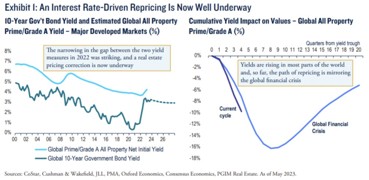 Die Zinsen von Staatsanleihen und Investment-Grade-Anleihen sowie die Aktiendividenden sind im vergangenen Jahr gestiegen. Daher müssen Immobilien eine entsprechend höhere Rendite bieten, um im Wettbewerb um Kapital zu bestehen. Auch die Fremdkapitalkosten sind gestiegen, was die Verfügbarkeit von Kapital und die Preise, die Investoren für Immobilien bieten können, begrenzt. Zusammengenommen können diese Faktoren nur eines bedeuten: eine Anpassung der Immobilienpreise an höhere Renditen - und dieser Korrekturprozess ist bereits in vollem Gange.