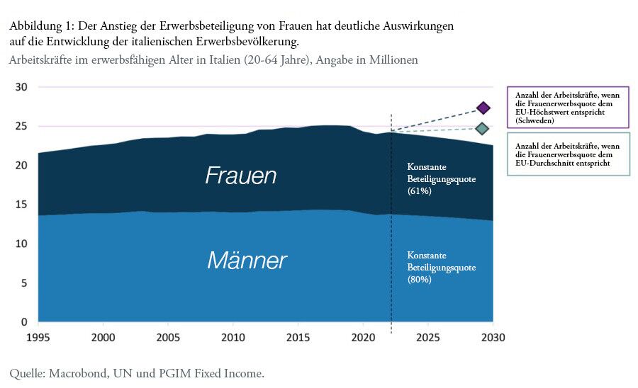 Die Kombination aus höherer Erwerbsbeteiligung und Produktivität auf EU-Niveau bis 2030 könnte jährlich etwa 1,5% zum Wachstum des italienischen Bruttoinlandsprodukts beitragen. Dies würde die Wachstumsbremse durch den Bevölkerungsrückgang mehr als ausgleichen. Zudem würde eine höhere Erwerbsbeteiligung die Steuereinnahmen erhöhen und unter sonst gleichen Bedingungen zum Schuldenabbau beitragen – ein zusätzlicher Impuls für die chronisch hohe Verschuldung Italiens. Höhere Einnahmen würden mehr Spielraum für Investitionen schaffen und gleichzeitig eine alternde Bevölkerung unterstützen.
