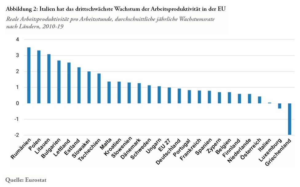 Ein weiterer Bereich, in dem sich Italien verbessern könnte, ist die Produktivität. Italien hat in den letzten zwei Jahrzehnten das niedrigste Wachstum der Arbeitsproduktivität in der EU verzeichnet. Laut Istat ist das Bildungsniveau der italienischen Frauen höher als das der Männer, zudem steigt das Bildungsniveau der Frauen schneller. Die Vorteile einer höheren Erwerbsbeteiligung von Frauen würden daher über eine bloße Erhöhung der Kopfzahl hinausgehen und die Produktivität weiter verbessern.