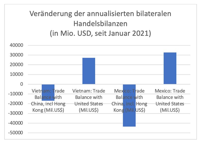 Wie passt dies zu den Meldungen über die zunehmende Exportdurchdringung, d. h. die Verlagerung von Lieferketten in Länder wie Mexiko und Vietnam? Nun, diese Länder haben viel mehr aus China importiert – ihre höheren Handelsüberschüsse mit den USA wurden zu einem erheblichen Teil durch höhere Defizite mit China ausgeglichen. Im Falle Mexikos liegt das Wachstum des Defizits mit China sogar höher als der Anstieg des Handelsüberschusses mit den USA.