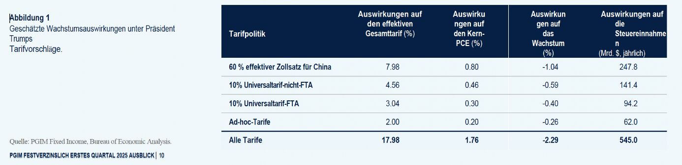 Was die Zölle betrifft, so dürfte eine Erhöhung des effektiven Zollsatzes um 1 Prozentpunkt zu einem Anstieg des Kern-PCE in den USA um 0,1 Prozentpunkte, einem Rückgang des BIP um 0,13 Prozentpunkte und zusätzlichen Zolleinnahmen in Höhe von 31 Milliarden Dollar pro Jahr führen. Darüber hinaus reichen die geschätzten Auswirkungen erhöhter Zölle auf das US-Finanzdefizit bis 2029 von fast 200 Milliarden Dollar bis zu 2,1 Billionen Dollar.