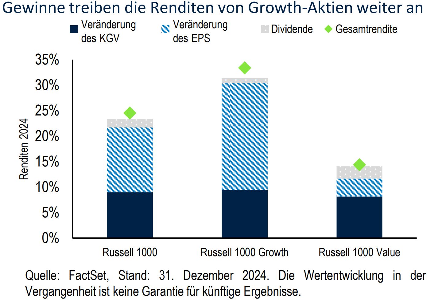 Im Jahr 2024 waren die Gewinne weiterhin sehr wichtig für die Entwicklung von Growth-Aktien, während Value-Sektoren von einem Anstieg der Bewertungskennzahlen profitierten. Die Gewinnerwartungen für 2025 sprechen nach wie vor für Growth-Aktien.