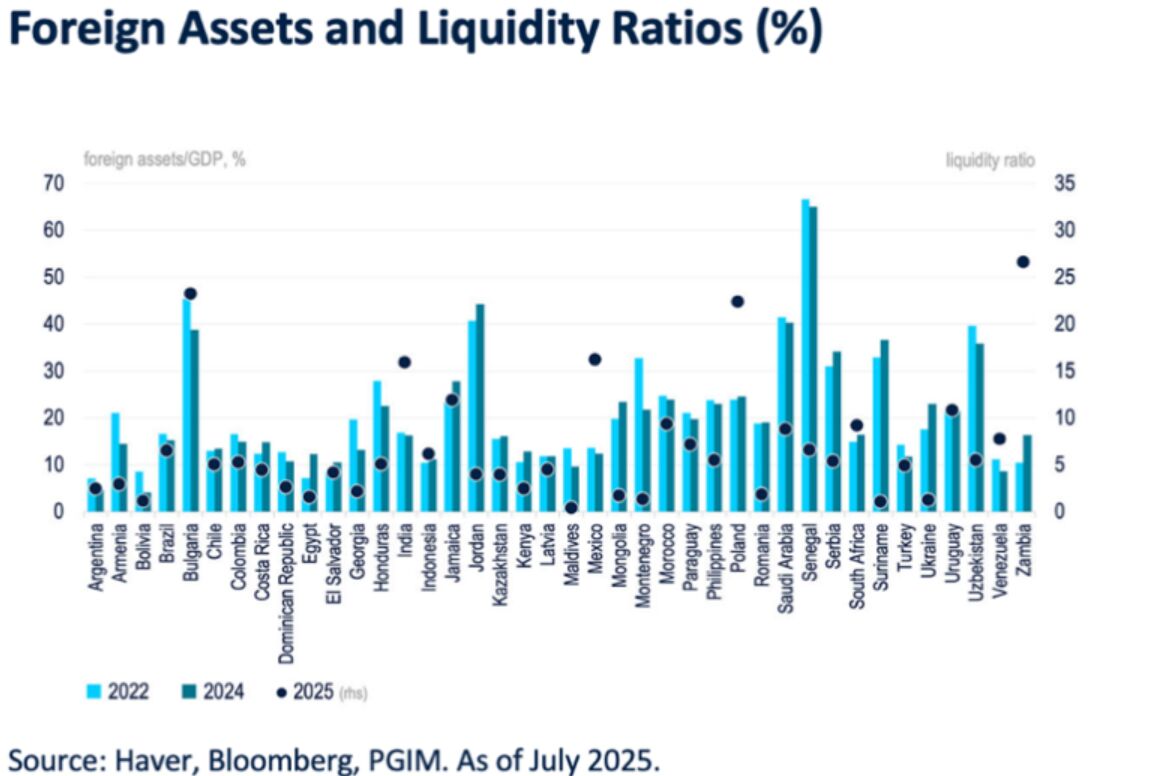 Zur Veranschaulichung zeigt die folgende Abbildung die Veränderung der Auslandsvermögen, einschließlich Gold, für 40 Schwellenländer zwischen 2022 und 2024 und die daraus resultierende Liquiditätsquote.