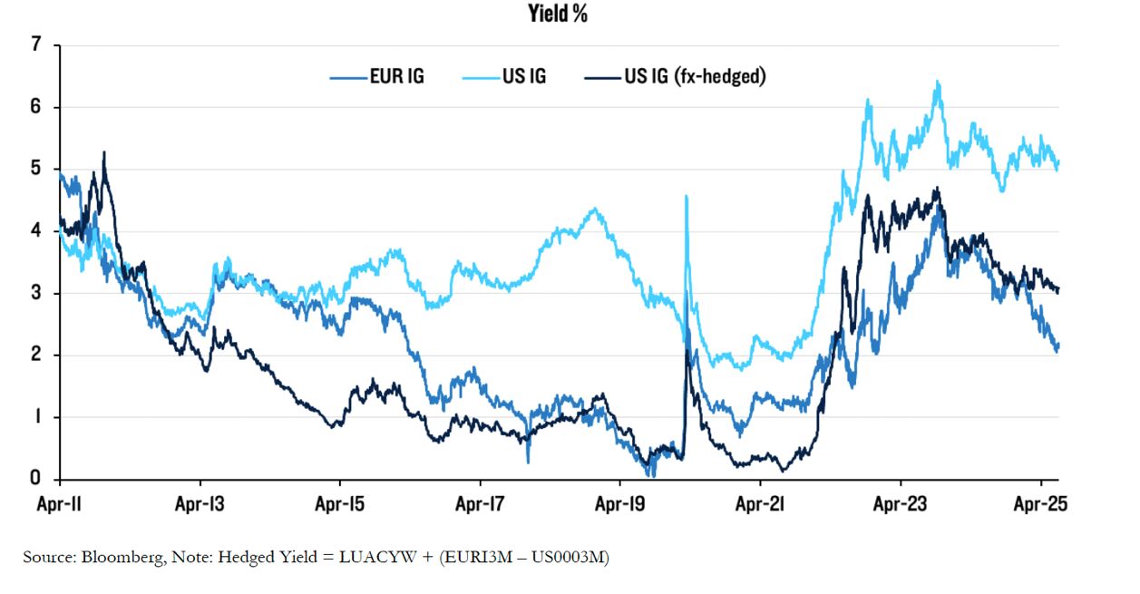 Vor dem Hintergrund zunehmender Unsicherheit in den USA hinsichtlich der Zölle und des politischen Drucks auf die Fed bietet Europa attraktive Investitionsmöglichkeiten. Die Renditen europäischer Anleihen haben im Vergleich zum letzten Jahrzehnt deutlich attraktivere Niveaus erreicht. So sind etwa die Renditen langfristiger Anleihen auf den Märkten für europäische Staatsanleihen deutlich höher als vor der Pandemie, und ihre Zinskurven sind viel steiler als in den USA. Dies bietet interessante Opportunitäten für langfristige Anleger, die kurzfristige Schwankungen verkraften können. Außerdem haben die im Vergleich zu den USA schnelleren Zinssenkungen der Europäischen Zentralbank die Zinsdifferenz vergrößert, wodurch die Absicherung des US-Dollars für europäische Anleger teurer geworden ist. Infolgedessen bieten europäische Unternehmensanleihen, insbesondere Hochzinsanleihen, nun ein attraktiveres Gesamtrenditeprofil, was ihre relative Attraktivität in globalen Rentenallokationen erhöht.