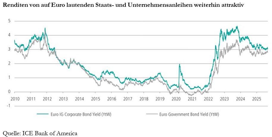 Weitere Faktoren, die Unternehmensanleihen zugutekommen, sind unter anderem erhebliche Staatsausgaben für die Sektoren Infrastruktur und Verteidigung, der allgemeine Zustand der europäischen Unternehmensbilanzen, positive strukturelle Entwicklungen in bestimmten Märkten und technische Faktoren wie eine robuste Anlegernachfrage.