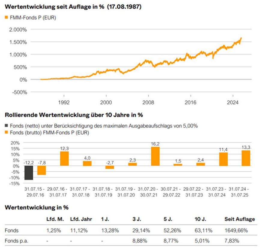 Der FMM-Fonds hat sich im laufenden Jahr erneut als robust und reaktionsschnell in einem von Unsicherheit geprägten Marktumfeld erwiesen. Mit einer Wertentwicklung von 11,22% seit Jahresbeginn1 (Stand: 31.07.2025) gehört er aktuell erneut zu den Spitzenreitern in seiner Peergroup Aktienfonds All Cap Welt2.
