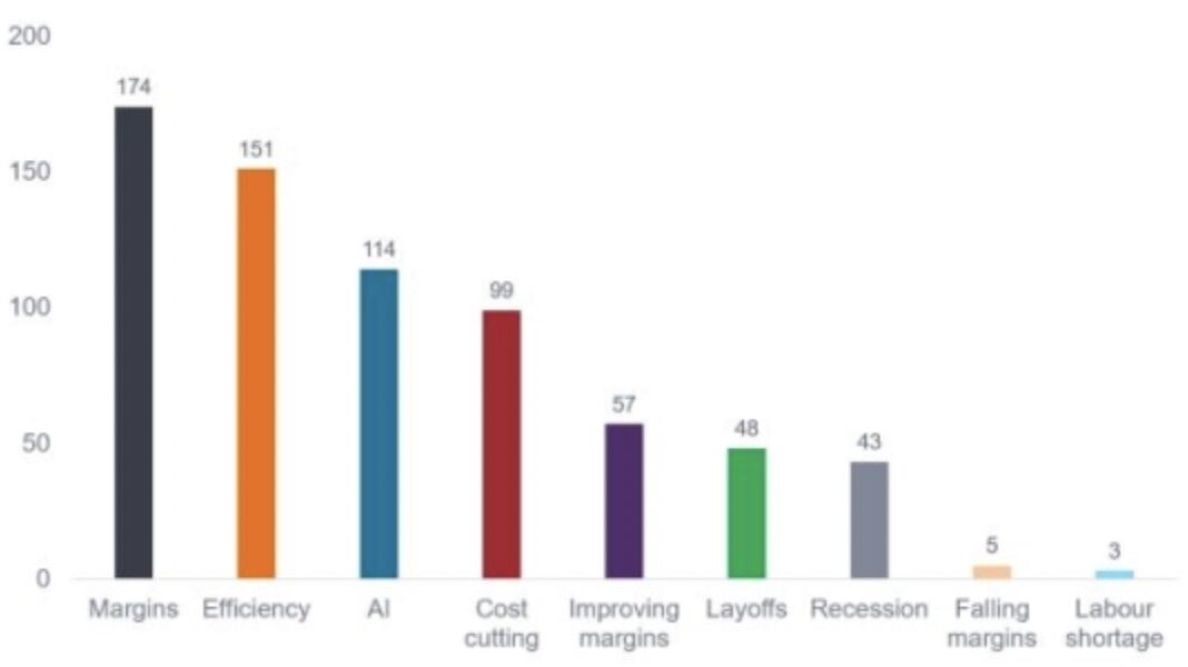 Die Schlagzeilen über den Untergang unprofitabler Technologiewerte wirkten sich generell auf die Anlegerstimmung im Technologiesektor aus. Der globale Zinsanstieg hat die Marktstimmung verschoben, von „Wachstum um jeden Preis“ hin zu Unternehmen mit profitablem Wachstum und Selbstfinanzierung. Auf der wichtigsten Technologiekonferenz von Morgan Stanley im März wurde besonders auf Schlüsselwörter, die in den Unternehmenspräsentationen fielen, geachtet: Am häufigsten genannt wurden Margen, Effizienz, Kostensenkungen und Entlassungen – Abbildung 1. Mark Zuckerberg prägte den Begriff „Jahr der Effizienz“ in seinem Brief an die Meta-Mitarbeiter zu Jahresbeginn (die Aktie ist seit Jahresbeginn um mehr als 100% gestiegen).6