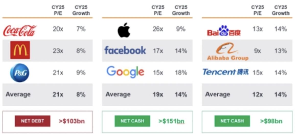 Quelle: Janus Henderson Investors, Bloomberg-Konsensschätzungen und Bloomberg-Nettoverschuldung und -Nettobargeld, Stand: 12. Juli 2023. Die dargestellten Daten basieren auf Prognosen (ohne Nettoverschuldung und Nettobargeld). Zur Veranschaulichung und nicht als Hinweis auf eine tatsächliche Investition. Die Verweise auf einzelne Wertpapiere stellen keine Empfehlung zum Kauf, Verkauf oder Halten eines Wertpapiers, einer Anlagestrategie oder eines Marktsektors dar und sollten nicht als profitabel angesehen werden. Janus Henderson Investors, die mit ihr verbundenen Berater oder ihre Mitarbeiter können eine Position in den genannten Wertpapieren haben.