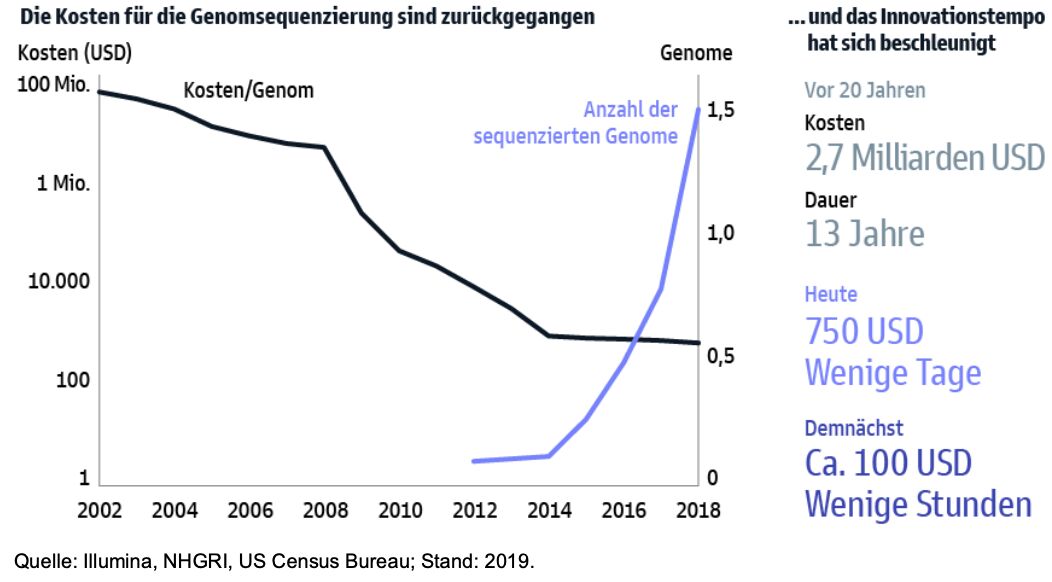 1. Quelle: Forbes, „How Human Genome Sequencing Went From $1 Billion A Pop To Under $1,000“; Stand: Oktober 2020.