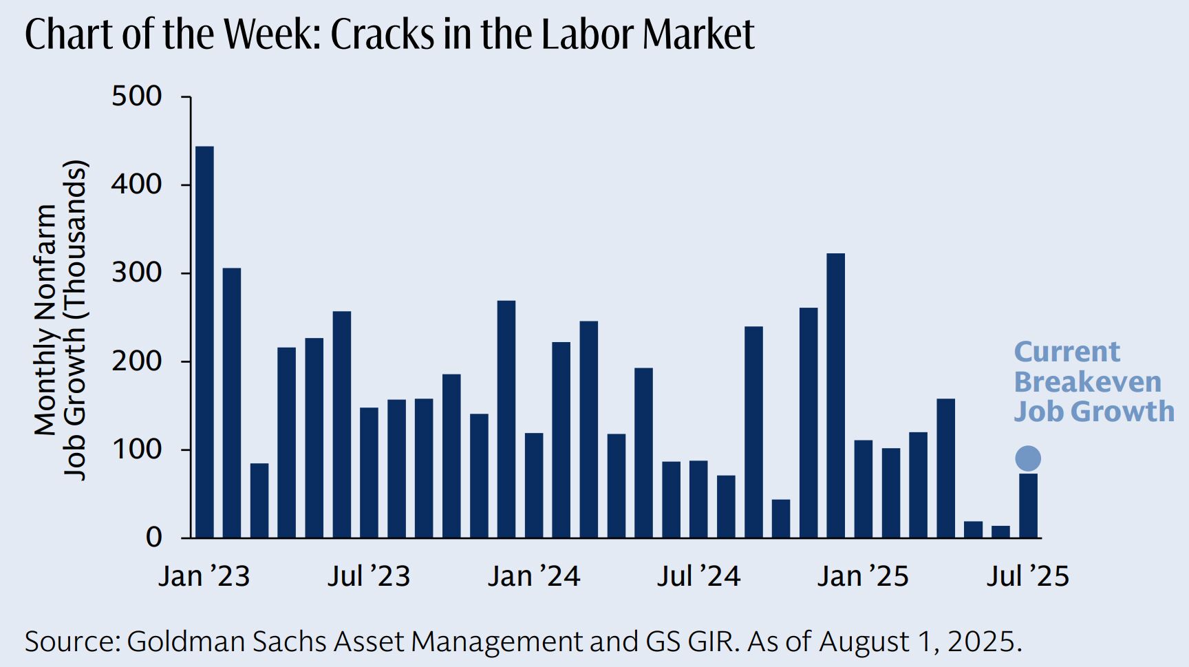 Dieses Beschäftigungswachstum liegt unter den Schätzungen von Goldman Sachs Global Investment Research (GIR) für die Rate, die erforderlich ist, um die Arbeitslosenquote stabil zu halten – derzeit 90.000. Bleibt das Jobwachstum unterhalb dieser „Breakeven“-Marke, dürften sich die Risse im Arbeitsmarkt vergrößern, was zu einem schnelleren und tieferen Lockerungszyklus führen könnte.