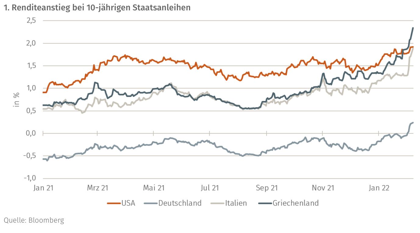 Die Inflation in den USA und Europa ist in der zweiten Hälfte des vergangenen Jahres mit voller Wucht zurückgekehrt. So stiegen die Preise in den USA im Januar um 7,5 Prozent, während die Inflation in der Eurozone mit 5,1 Prozent das höchste Niveau seit Einführung der Gemeinschaftswährung erreichte. Die Federal Reserve hat sich mittlerweile von der Einschätzung verabschiedet, es handle sich bei der Inflation nur um ein vorübergehendes Phänomen, das ohne eine straffere Geldpolitik verschwinden würde. Dementsprechend beschlossen die amerikanischen Währungshüter, ihre (Netto-) Wertpapierkäufe im Frühjahr einzustellen und so den Weg für Zinserhöhungen freizumachen. Das Umschwenken der Fed ließ die Zinsen an den Rentenmärkten nicht nur in den USA, sondern auch in Europa ansteigen. So erreichten 10-jährige Bundesanleihen im Januar erstmals seit Mai 2019 wieder positives Territorium. Risikoaufschläge italienischer und griechischer Staatsanleihen weiteten sich in den letzten sechs Monaten von jeweils 100 Basispunkten auf 160 bzw. 210 Basispunkte aus.