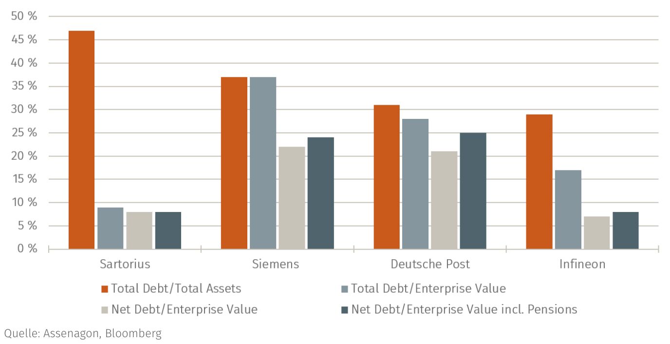 Betrachtet man die klassische Fremdkapitalquote in Abbildung 1, so weist der Pharma- und Laborzulieferer Sartorius die höchste Verschuldung auf. Jedoch ist dieses Bild trügerisch, denn insbesondere bei Sartorius unterschätzt der Buchwert signifikant den tatsächlichen Unternehmenswert. Bei Infineon wiederum senkt der Barmittelbestand die Verschuldung deutlich. Auffällig sind zudem die hohen Pensionsverpflichtungen der Deutschen Post, die nach Berücksichtigung sämtlicher Faktoren den höchsten Verschuldungsgrad zeigt.