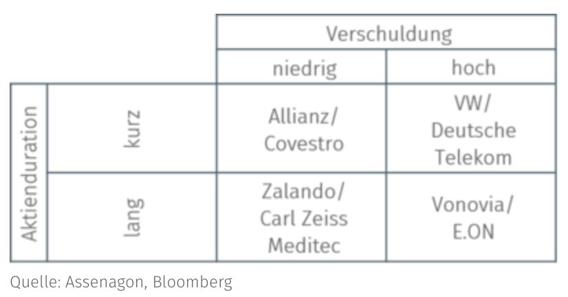 Tabelle 1 vergleicht beispielhaft deutsche Aktien hinsichtlich dieser beiden Dimensionen. Unternehmen wie Vonovia und E.ON mit langer Duration und hoher Verschuldung leiden in Zeiten steigender Zinsen doppelt, gegenteiliges gilt für Allianz und Covestro mit kurzer Duration und niedriger Verschuldung. Bei den weiteren Beispielen wirken die Effekte in gegensätzlicher Richtung.