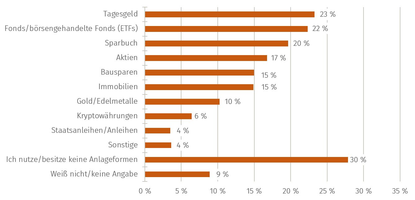 Bei ihrer Geldanlage setzen die Deutschen weiterhin auf die bewährten Anlageformen und geben auf die Fragen nach den genutzten Anlageformen an, vorrangig Tagesgeld (23 Prozent), Fonds (22 Prozent), Sparbuch (20 Prozent) oder Aktien (17 Prozent) zu besitzen. Unter genutzten Anlageformen liegen auch das Bausparen und Immobilien mit jeweils 15 Prozent weit vorne. Gold und Edelmetalle (10 Prozent) spielt dagegen eine geringere Rolle und werden nur durch Kryptoinvestments (6 Prozent) und Staatsanleihen (4 Prozent) unterboten.