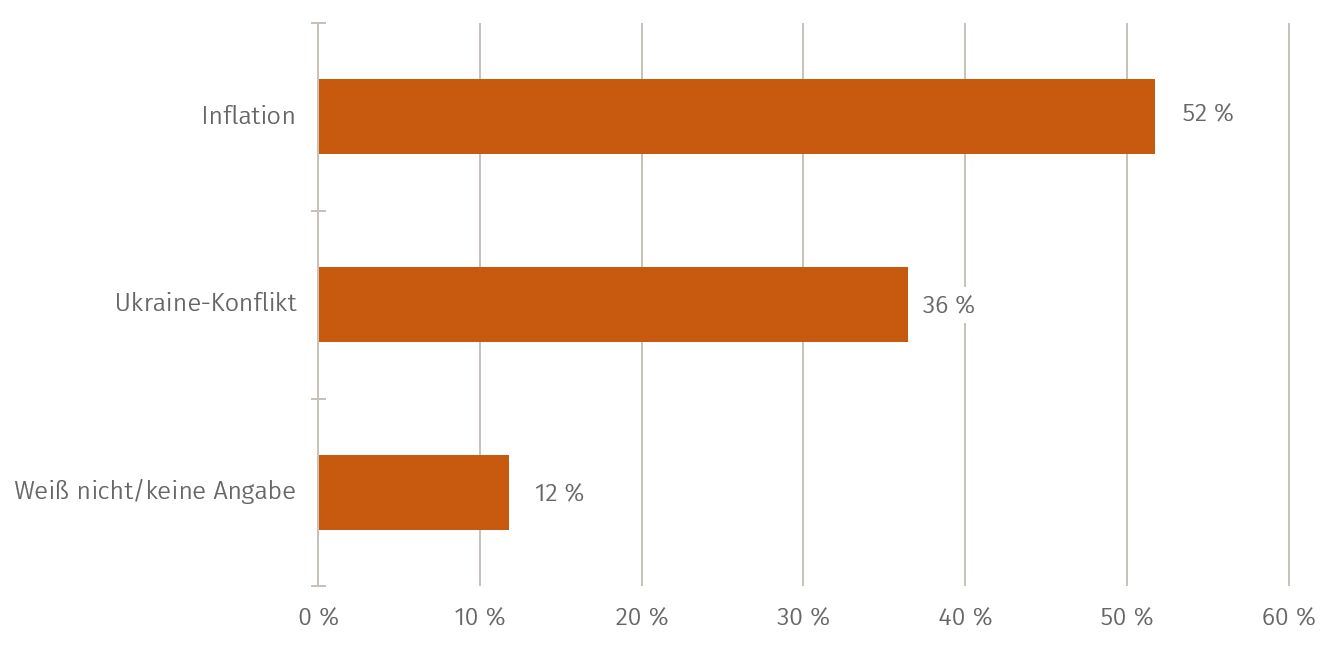 36 Prozent geben dagegen an, dass Ihnen der Ukraine-Konflikt noch mehr Kopfzerbrechen bereitet. Untermauert werden diese Zahlen durch die tatsächlichen Reaktionen der Deutschen. Lediglich 26 Prozent der Deutschen geben an, aufgrund der immensen Preissteigerungen nicht vermehrt auf ihre Konsumausgaben zu achten. Die Inflationsentwicklung ist somit im Alltag vieler Deutscher angekommen und hat zu einem Umdenken geführt.