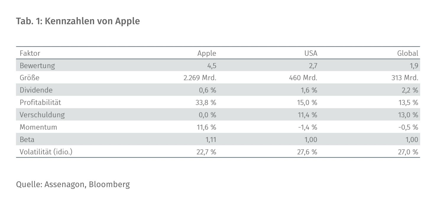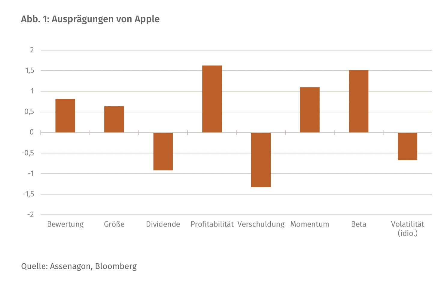 Aufgrund dessen, dass die Aktie auf Sicht von einem Jahr (ohne den letzten Monat, das sogenannte short-term Reversal) den amerikanischen Aktienmarkt outperformt hat, weist sie ein positives Momentum auf. Darüber hinaus zeichnet sich die Aktie durch ein hohes Beta aus, das heißt Apple weist eine überdurchschnittliche Sensitivität zu Marktschwankungen auf. Für eine robuste Aussagekraft des Betas wird ein Glättungsverfahren in Abhängigkeit vom Erklärungsgehalt angewendet. Das firmenspezifische Risiko (idiosynkratische Volatilität) nach Bereinigung um die Marktschwankung und die Sensitivität dazu (eben jenes Beta) fällt hingegen gering aus.