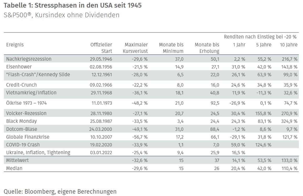 Seit 1945 gab es in den Vereinigten Staaten gemessen am S&P500® insgesamt zwölf Bärenmärkte, definiert als Kursrückgänge von mehr als 20 Prozent. In der Regel wurden diese durch realwirtschaftliche Probleme oder exogene Schocks ausgelöst, welche das Vertrauen der Investoren erschütterten. Häufig – aber nicht immer – gingen Bärenmärkte mit Rezessionen einher: Sinkende Unternehmensgewinne und steigende Arbeitslosigkeit schwächten die Erwartungen an die zukünftige Wirtschaftsentwicklung. Ein klassisches Beispiel hierfür ist die Ölkrise der Jahre 1973/74: Explodierende Energiepreise führten zu einer Stagflation, der S&P500® brach in der Spitze um 48 Prozent ein.