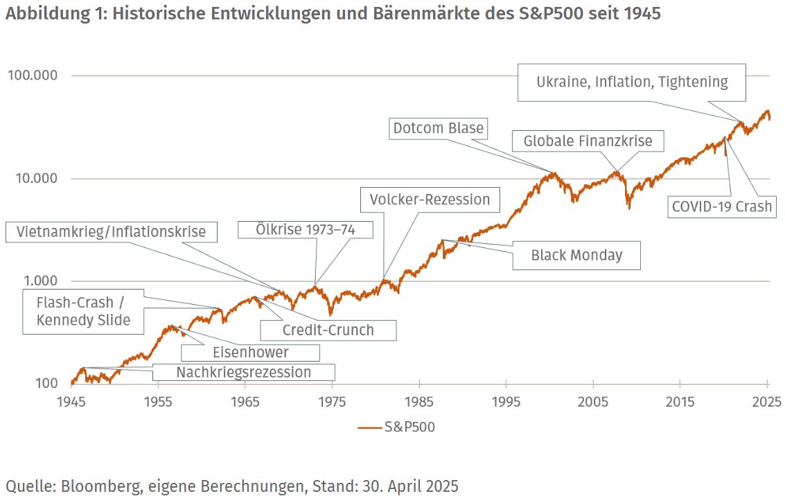 Aktienmärkte durchlaufen immer wieder Phasen erheblicher Belastung und Unsicherheit. In solchen Stressphasen gehen die Kurse stark zurück, die Stimmung schwankt zwischen Angst und Pessimismus. Für viele Anleger scheinen diese Zeiten vor allem eine Gefahr zu sein – die Sorge vor dauerhaften Verlusten dominiert das Handeln. Jüngst sorgte die erratische Zollpolitik der US-Regierung wieder für starke Kursverluste und hohe Volatilität an den Märkten. Doch Börsenkrisen stellen nicht nur Bedrohung für das Vermögen dar, sondern können auch Chancen bieten. Ein Blick auf die bewegte Historie der Aktienmärkte kann langfristig orientierten Anlegern helfen, Stressphasen richtig einzuordnen. Dieser Beitrag konzentriert sich auf historische Erfahrungen am Beispiel des US-amerikanischen Aktienmarkts; vergleichbare Muster gelten grundsätzlich auch für globale Märkte, wobei diese in Vergangenheit häufig eine etwas geringere Dynamik und Robustheit aufwiesen.