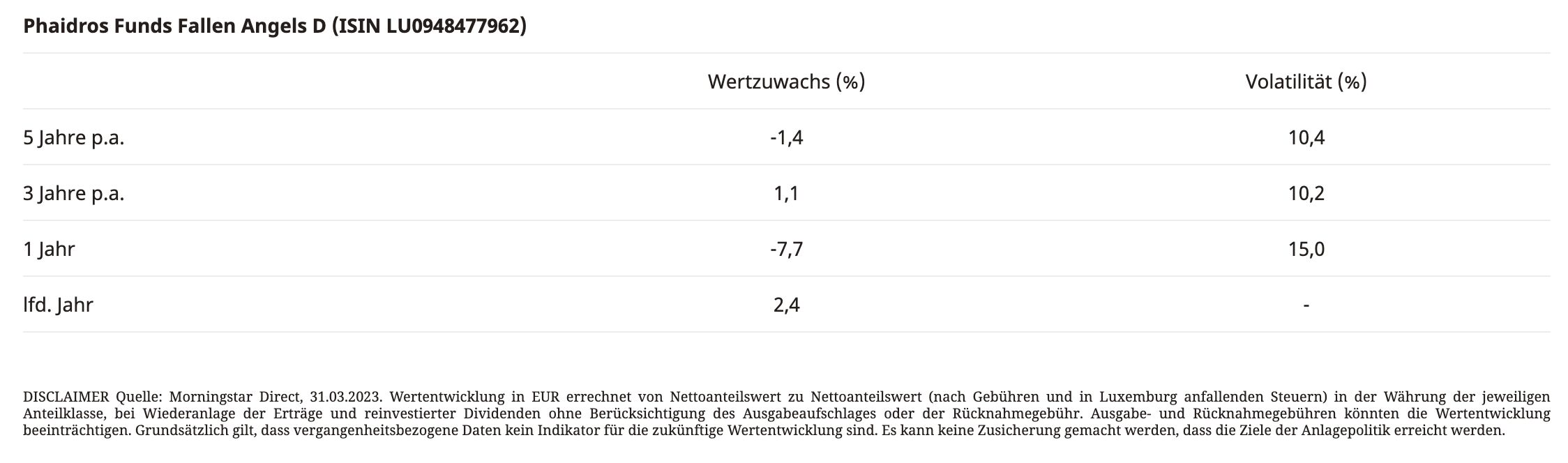 Der Phaidros Funds Fallen Angels gab im März je nach Anteilsklasse zwischen -2,39% und -2,44% nach. Der europäische High Yield Index (Bloomberg Pan-European High Yield Index) beendete den Monat mit einem Minus von 0,41%. Die Rendite 10-jähriger Bundesanleihen kehrten die Februarbewegung um und beendeten den März 36 Basispunkte tiefer bei 2,29%.
