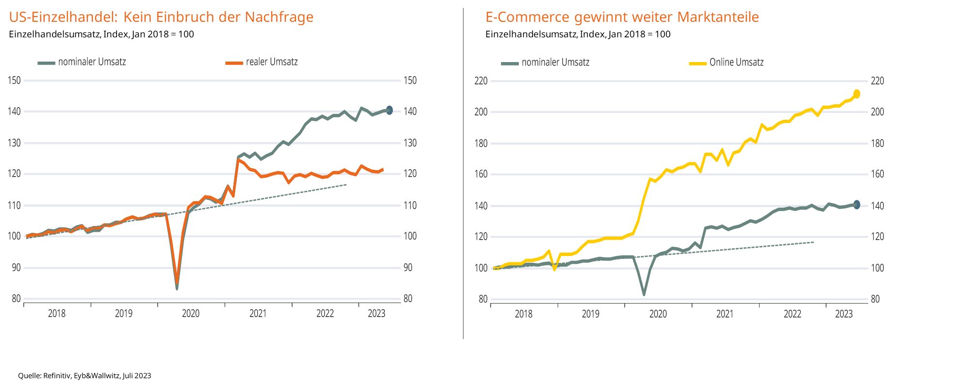 Die Juni-Daten zum Einzelhandelsumsatz verdeutlichen, dass der US-Konsum zwar nicht mehr boomt. Ein Einbruch der Konsumnachfrage zeichnet sich aber weiter nicht ab. Hierzu trägt vor allem die nach wie vor stabile Lage am Arbeitsmarkt bei. Der rückläufige Trend der Inflation stützt dabei die reale Kaufkraft der Einkommen. Ein Soft Landing der US-Wirtschaft bleibt unser Basisszenario. Innerhalb dieses Szenarios gewinnen die großen Online-Händler weiter Marktanteile.