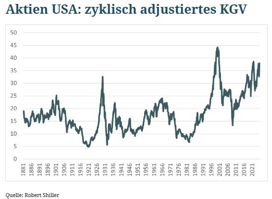 Für den amerikanischen Aktienmarkt lässt sich die Situation auch anhand des von Robert Shiller über den Zyklus geglätteten Kurs-Gewinn-Verhältnisses veranschaulichen: Es liegt aktuell bei 37,9 und damit auf einem Niveau, das für die kommenden Jahre ausgesprochen schwache Renditen erwarten lässt. Wer heute teuer investiert, wird erfahrungsgemäß lange brauchen, bis er den Kaufpreis zurückverdient hat.