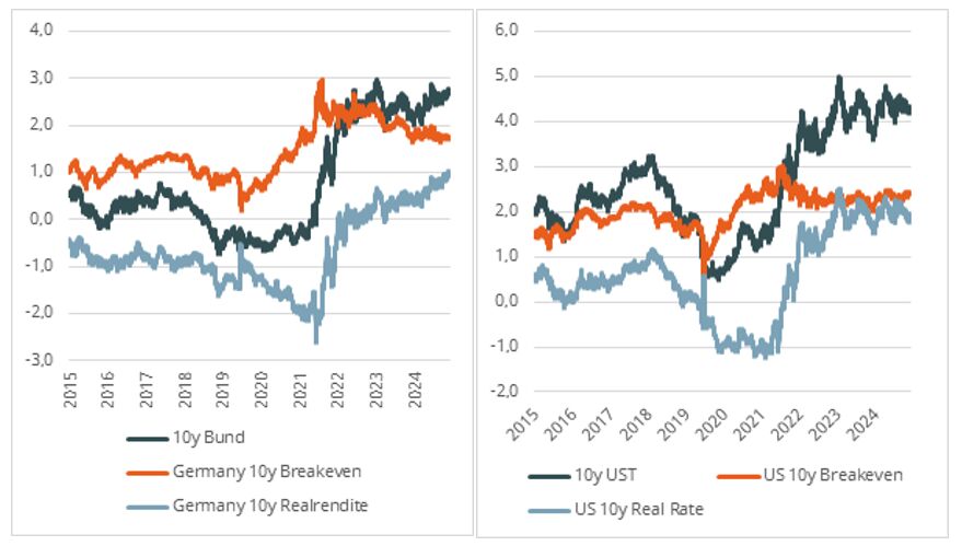 Abbildung 2: 10y-Nominalrenditen, 10y-Breakevens und 10y-Realrenditen seit 2015 in Prozentpunkten für Deutschland und die USA
