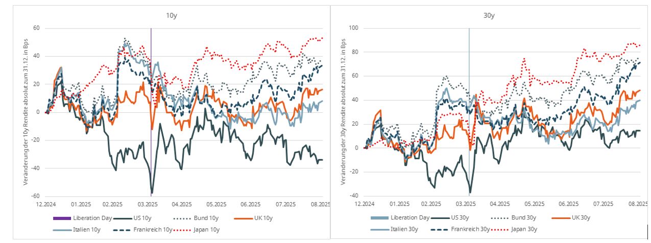 Abbildung 1: Absolute Veränderung in Basispunkten der 10y- und 30y-Staatsanleiherenditen in den USA, UK, Deutschland, Frankreich, Italien und Japan seit dem 31.12.2024