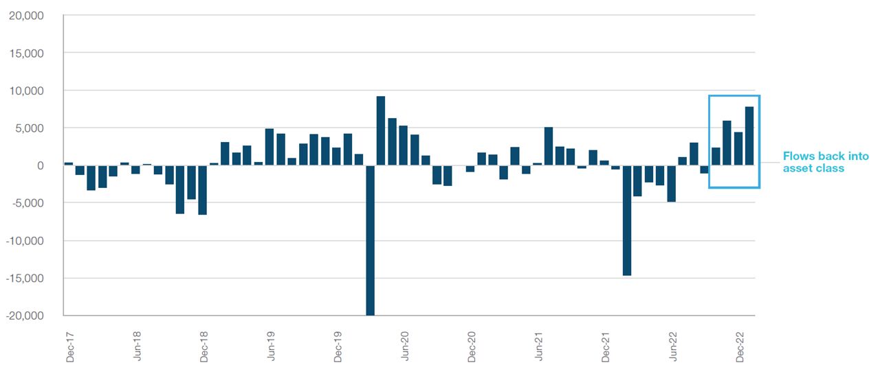 Seit Oktober 2022 ist die Nachfrage der Investoren nach der Anlageklasse gestiegen, was sich in positiven Nettozuflüssen widerspiegelt. Die jüngste Suche der Anleger nach höheren Renditen scheint allen Segmenten des Marktes für Euro-Unternehmensanleihen zugutezukommen, von Anleihen mit kurzer Laufzeit bis hin zu Papieren mit niedrigerem Rating, und angesichts der aktuellen Nachfrage der Marktteilnehmer nach Neuemissionen rechne ich mit einer Fortsetzung dieses Trends.