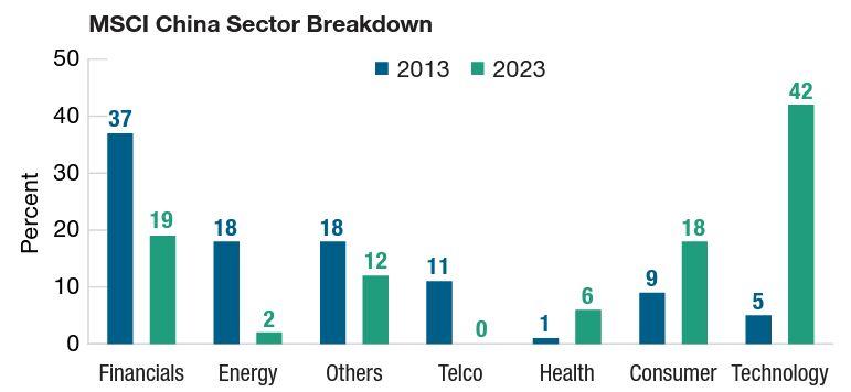 Die Struktur des chinesischen Aktienmarktes hat sich in den letzten zwei Jahrzehnten dramatisch verändert, und wir gehen davon aus, dass sich dies fortsetzen wird. Dynamische Branchen- und Sektortrends sind in China die Regel. Anleger müssen daher jeden wichtigen Trend antizipieren, wenn sie die Nase vorn haben wollen. Der Konsum-, Gesundheits- und Technologiesektor hat seit 2012 deutlich an Bedeutung gewonnen, während die Sektoren Finanzen, Energie und Telekommunikation allesamt geschrumpft sind.