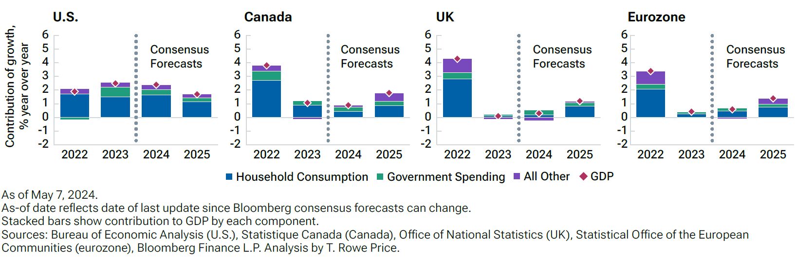 Das Wirtschaftswachstum in den USA hat das anderer Industrieländer in letzter Zeit übertroffen. Im Jahr 2023 wuchs das Bruttoinlandsprodukt (BIP) in den USA um 2,5%. Zur selben Zeit wuchs die kanadische Wirtschaft mit 1,1% weniger als halb so schnell. Die Wachstumsleistung in Großbritannien und im Euroraum war im Vergleich dazu sogar noch schwächer. Der US-Verbraucher hat das Wachstum weiter angetrieben, unterstützt durch einen starken Arbeitsmarkt. Die Zahl der offenen Stellen ist nach wie vor hoch und die Fluktuation gering, da die Unternehmen nach den extremen Schwierigkeiten bei der Einstellung von Talenten in den letzten zwei Jahren an ihren Mitarbeitern festgehalten haben. Ein unterschätzter Faktor war jedoch die Steuerpolitik. Die Steuerausgaben machten im vergangenen Jahr fast 30% des US-Wachstums aus, wobei die Ausgaben sowohl auf Bundes- als auch auf Staatsebene recht kräftig ausfielen. Nach übereinstimmenden Prognosen wird sich das überdurchschnittliche Wachstum in den USA mittelfristig fortsetzen, angetrieben von einem ähnlichen Cocktail aus unterstützender privater und staatlicher Nachfrage. Die Divergenz zu anderen Volkswirtschaften wird sich voraussichtlich abschwächen, bleibt aber bemerkenswert, insbesondere in Bezug auf Europa.