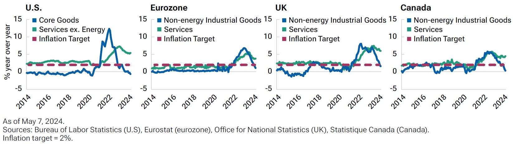 Die jüngste Verlangsamung des BIP- und Beschäftigungswachstums in den USA deutet darauf hin, dass die Outperformance der USA nachlassen könnte. Es ist auch möglich, dass die US-Daten über das Beschäftigungswachstum hinaus durch günstige saisonale Elemente im ersten Quartal begünstigt wurden, was bedeutet, dass die Inflation in naher Zukunft ebenfalls zurückgehen könnte. Dadurch könnte sich die Marktmeinung schnell in Richtung einer weniger expansiven Geldpolitik in den USA verschieben, wodurch sich die Preisdifferenz zu anderen Industrieländern teilweise auflösen würde. Es ist auch möglich, dass sich der offensichtliche Stillstand der US-Inflation im ersten Quartal im weiteren Verlauf des Jahres auf andere Volkswirtschaften auswirken könnte. Die Wirtschaft des Vereinigten Königreichs sticht als möglicher Kandidat für eine stärkere Dienstleistungsinflation hervor, da die Anspannung auf dem Arbeitsmarkt größtenteils auf ein mangelndes Arbeitskräfteangebot zurückzuführen ist.