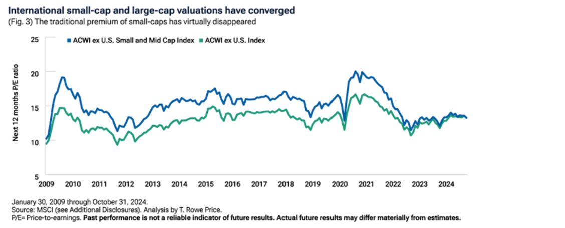 Internationale Small Caps (typischerweise repräsentiert durch den MSCI All Country World ex-USA Small and Mid Cap Index) wurden normalerweise mit einem Aufschlag gegenüber großen Unternehmen gehandelt, aber im Jahr 2024 verschwand dieser Aufschlag nach mehreren Jahren von COVID-bedingten Störungen und Herausforderungen in den Lieferketten. Unserer Ansicht nach bieten internationale Small Caps das Potenzial, ein stärkeres Gewinnwachstum je Aktie (EPS) zu erzielen als ihre internationalen großen Pendants in der kommenden Periode, da sich das wirtschaftliche Umfeld verbessert. Die Geschichte zeigt, dass nach Perioden mit rückläufigen Gewinnen das Gewinnwachstum von Kleinunternehmen in der Regel das der großen Unternehmen übertroffen hat. Wir erwarten, dass dies auch diesmal der Fall sein wird, aber diesmal ausgehend von einem Punkt extremer Bewertungsunterstützung für Kleinunternehmen, der dazu beitragen sollte, die Renditen der Anleger zu steigern.