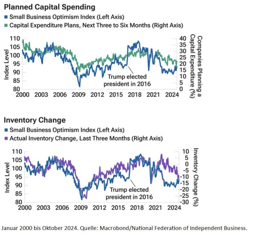 Der durch Trumps Wahlsieg ausgelöste Marktoptimismus wird durch die potenziellen Auswirkungen auf die Geschäftstätigkeit, insbesondere auf kleine Unternehmen, gestützt. Trumps Politik birgt jedoch das Risiko, dass Inflationssorgen wieder aufkommen.