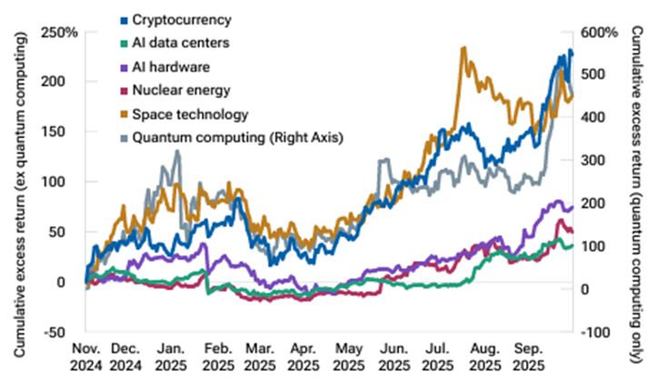 Aktien mit Engagement in den Bereichen Quantencomputing, Kryptowährungen, Weltraumtechnologie, KI-Ausbau und KI-Energiebedarf haben sich in diesem Jahr, insbesondere im dritten Quartal, deutlich überdurchschnittlich entwickelt.