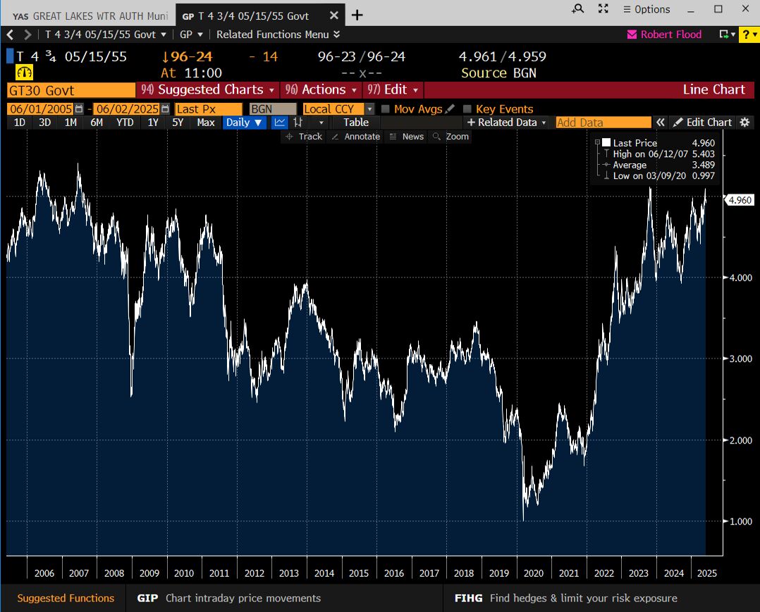 - Abgesehen von wenigen Wochen im Oktober 2023 ist die Rendite der 30-jährigen Treasury so hoch wie seit 2007 nicht mehr.