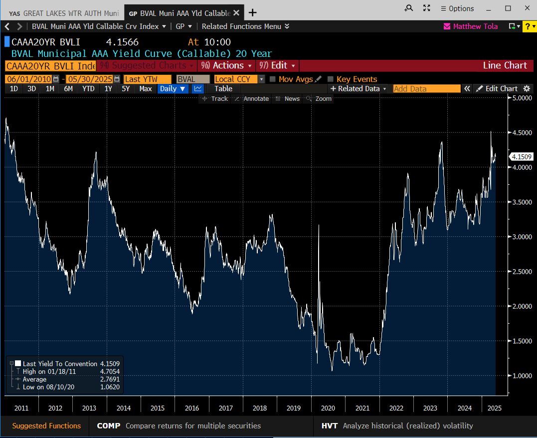 Renditen von AAA-gerateten 20-jährigen steuerfreien Kommunalanleihen (Tax-Exempt Munis) nahe historischer Höchststände