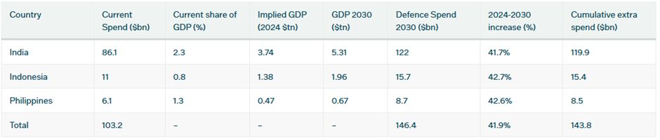 Für Indien, Indonesien und die Philippinen verfolgen wir einen anderen Ansatz. Im Gegensatz zu den reifen Mächten im indopazifischen Raum handelt es sich hierbei um schnell wachsende Volkswirtschaften, in denen das BIP-Wachstum wahrscheinlich das Wachstum der Verteidigungsausgaben übertreffen wird, selbst wenn letztere erheblich steigen.