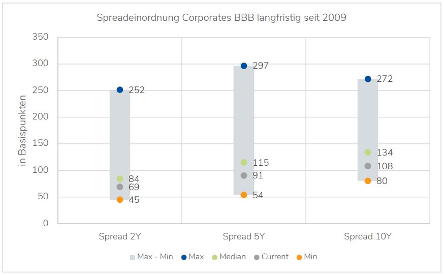 Historisch betrachtet bewegt sich der Spread-aufschlag von BBB Bonds zu Staatsanleihen in einem historisch niedrigen Bereich.