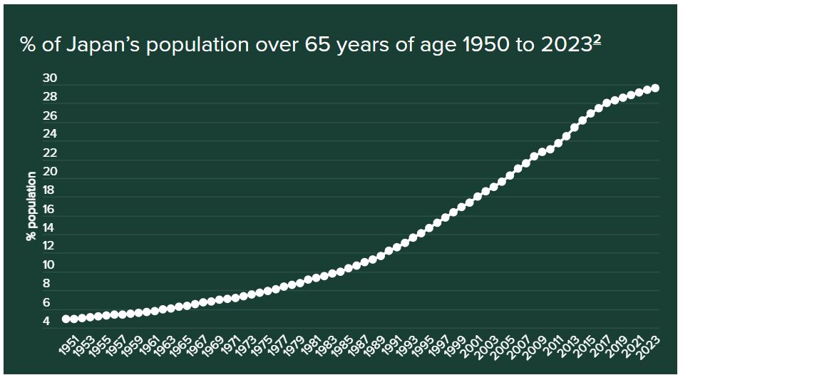 Die hohe Lebenserwartung und eine Geburtenrate, die vor 50 Jahren1 unter die Reproduktionsrate von 2,1 gesunken ist und derzeit bei 1,3 liegt, garantieren, dass die Rentner die japanische Gesellschaft im kommenden Jahrhundert zunehmend dominieren werden.