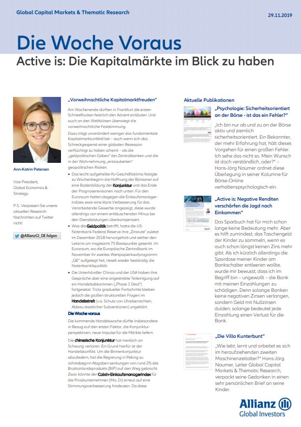 am Wochenende dürften in Frankfurt die ersten Schneeflocken feierlich den Advent einläuten. Und auch an den Weltbörsen überwiegt die vorweihnachtliche Feststimmung. Dazu trägt unverändert weniger das fundamentale Kapitalmarktumfeld bei – auch wenn sich das Schreckgespenst einer globalen Rezession verflüchtigt zu haben scheint – als die Hoffnungen der Börsianer auf einen prall gefüllten geld- und fiskalpolitischen „Gabentisch“ und die in der Wahrnehmung „entzauberten“ geopolitischen Risiken. Doch seit Kindertagen wissen wir: Selten werden zu Weihnachten sämtliche Wünsche erfüllt.