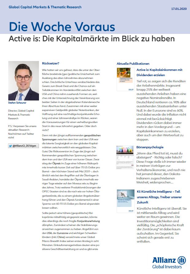 wie hatten wir uns gefreut, dass die unter der Oberfläche brodelnde (geo-)politische Unsicherheit zum Ausklang des alten Jahrzehntes abzunehmen schien. Das britische Unterhaus verabschiedete das Gesetz zum Brexit-Deal und die Chance auf ein Teilabkommen im Handelskonflikt zwischen den USA und China nahm zusehends Formen an, welches mit der Unterzeichnung der Vereinbarung von beiden Seiten in der abgelaufenen Kalenderwoche ihren Abschluss fand. Zusammen mit einer weiter expansiven Geldpolitik globaler Notenbanken, der Hoffnung auf eine nachhaltige konjunkturelle Erholung und einer Jahresendrallye im Rücken, waren die Voraussetzungen für einen verheißungsvollen Start in das neue Jahrzehnt gegeben. Oder doch nicht?