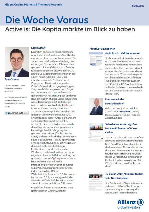 nachdem zahlreiche Aktienmärkte im abgelaufenen Monat neue Allzeithochs markierten, kam es zum Lackmustest: Die zunehmend weltweite Ausbreitung des neuartigen Corona-Virus führte an den globalen Aktienmärkten zum stärksten Rückgang seit mehr als zwei Jahren. 30-jährige US-Staatsanleihen rentierten auf einem neuen Allzeittief und Gold erreichte ein neues 7-Jahres-Hoch.