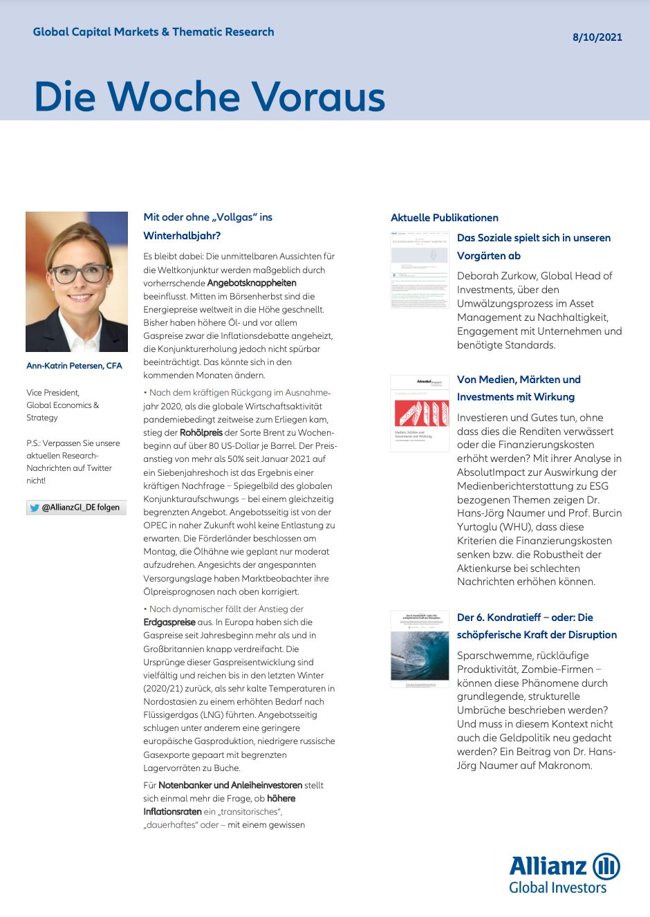 es bleibt dabei: Die unmittelbaren Aussichten für die Weltkonjunktur werden maßgeblich durch vorherrschende Angebotsknappheiten beeinflusst. Mitten im Börsenherbst sind die Energiepreise weltweit in die Höhe geschnellt. Bisher haben höhere Öl- und vor allem Gaspreise zwar die Inflationsdebatte angeheizt, die Konjunkturerholung jedoch nicht spürbar beeinträchtigt. Für Notenbanker und Anleiheinvestoren stellt sich einmal mehr die Frage, ob höhere Inflationsraten ein „transitorisches“, „dauerhaftes“ oder – mit einem gewissen Augenzwinkern – womöglich „dauerhaft transitorisches“ – Phänomen sind. Ob wir sprichwörtlich mit oder ohne „Vollgas“ ins europäische Winterhalbjahr starten, dürfte insbesondere von drei Faktoren abhängen.